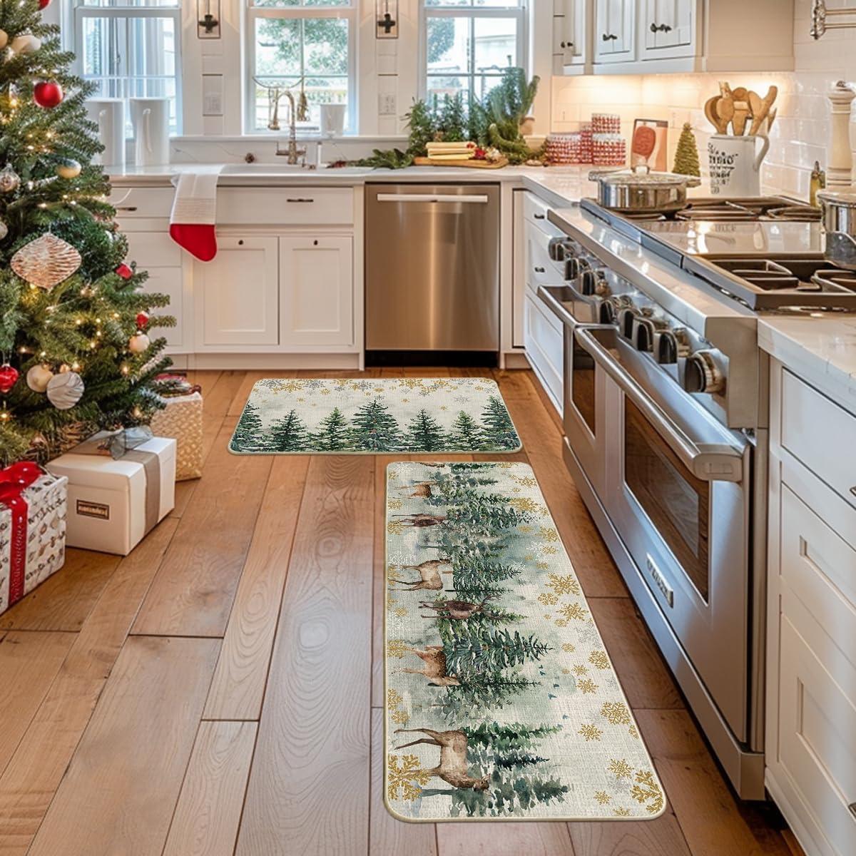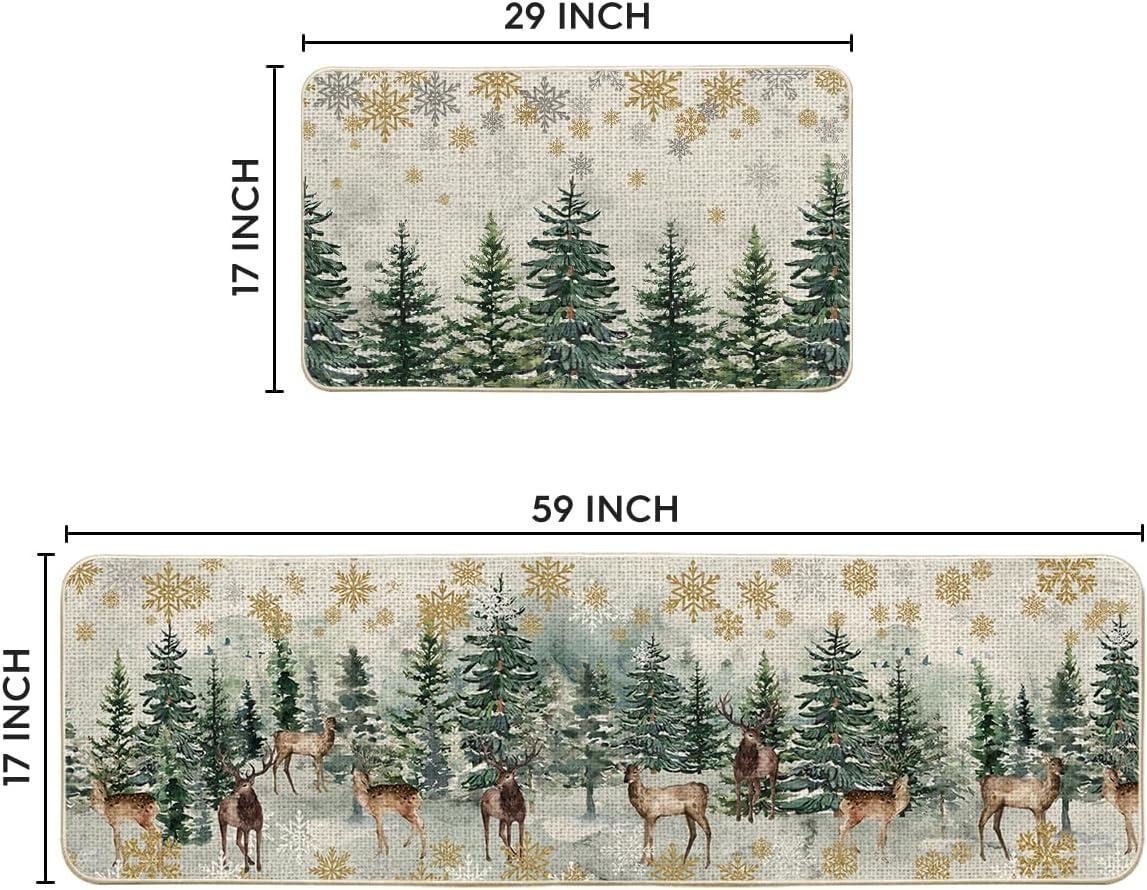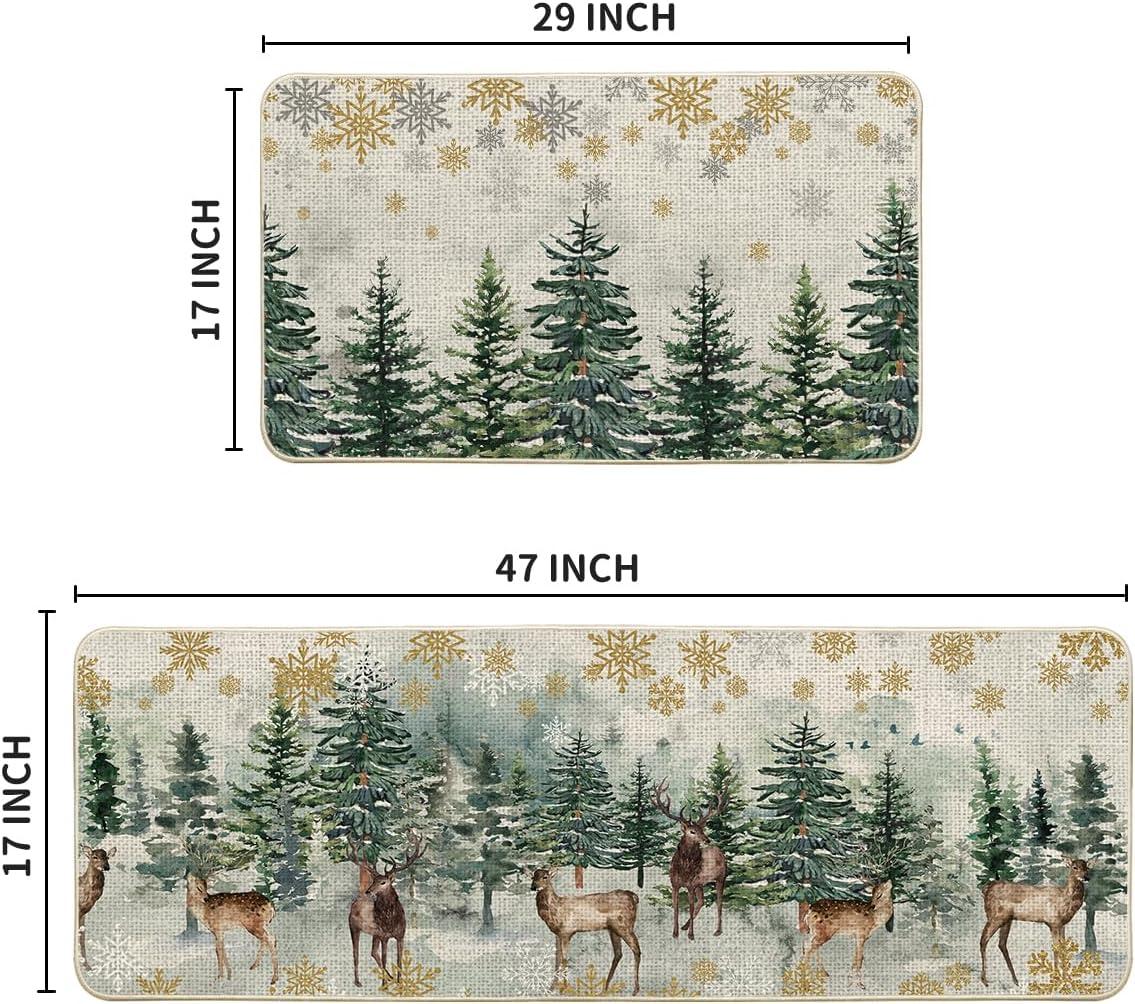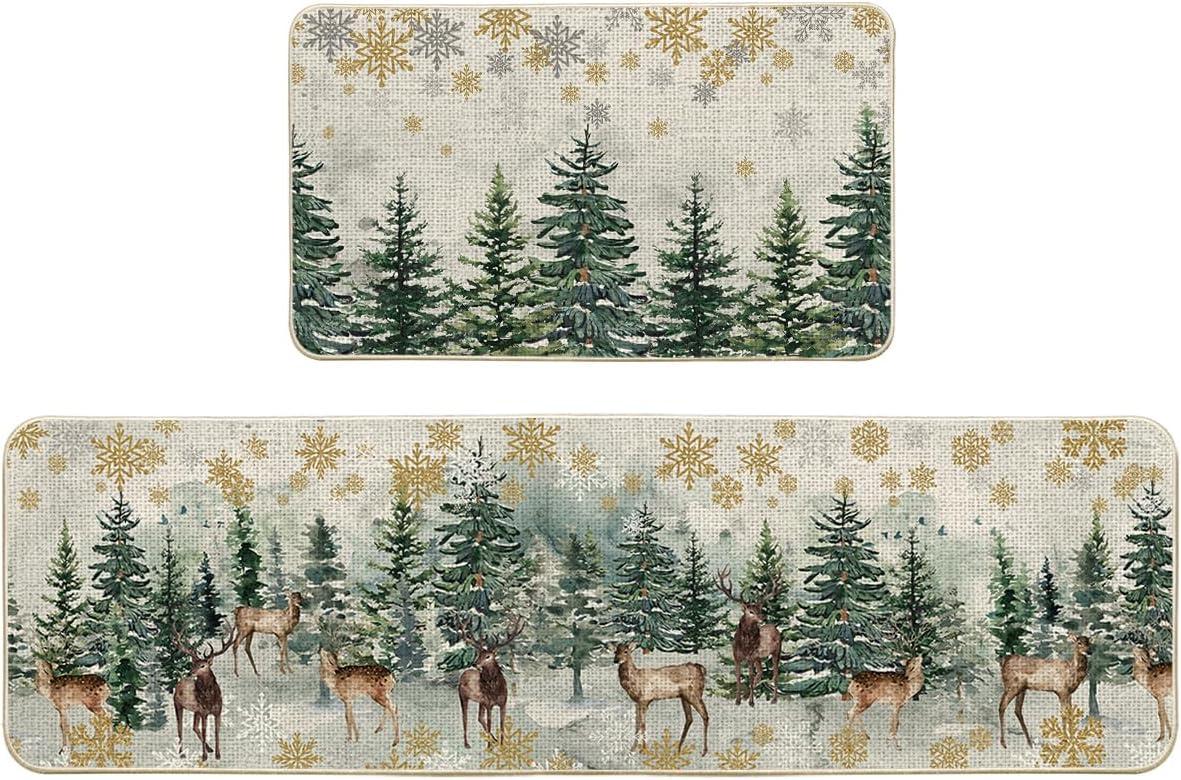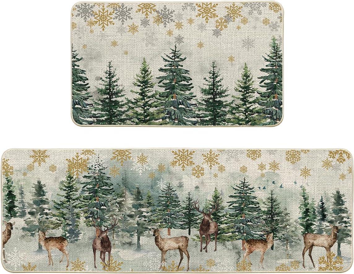 Artoid Mode Xmas Trees Deer Snowflakes Christmas Kitchen Mats Set of 2, Winter Home Decor Low-Profile Kitchen Rugs for Floor – 17×29 and 17×47 Inch(Green)