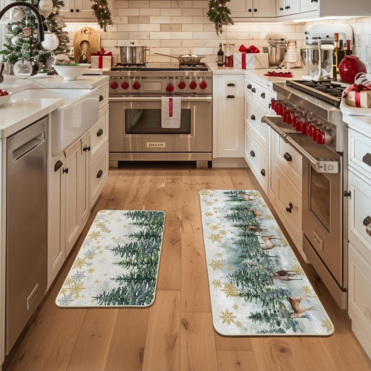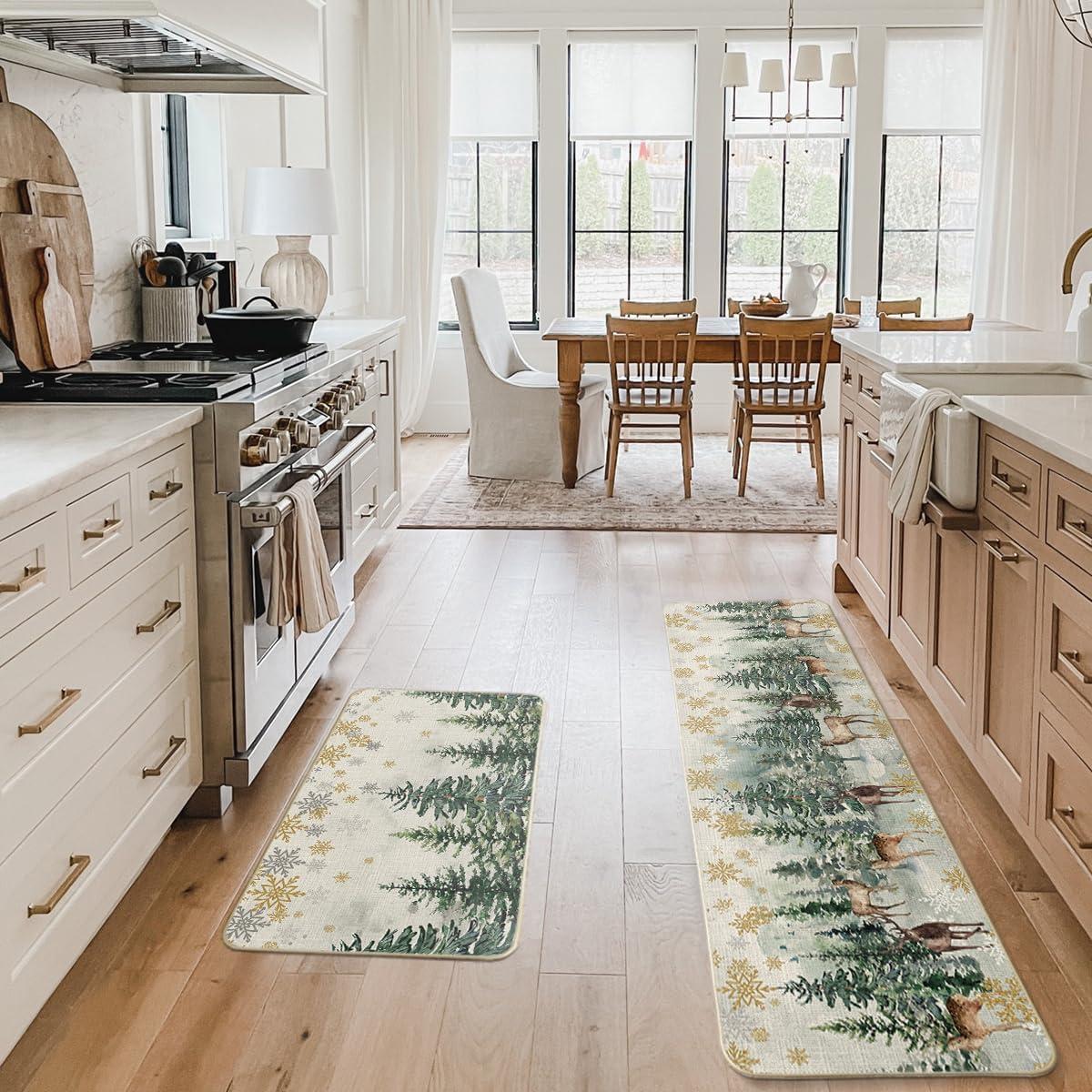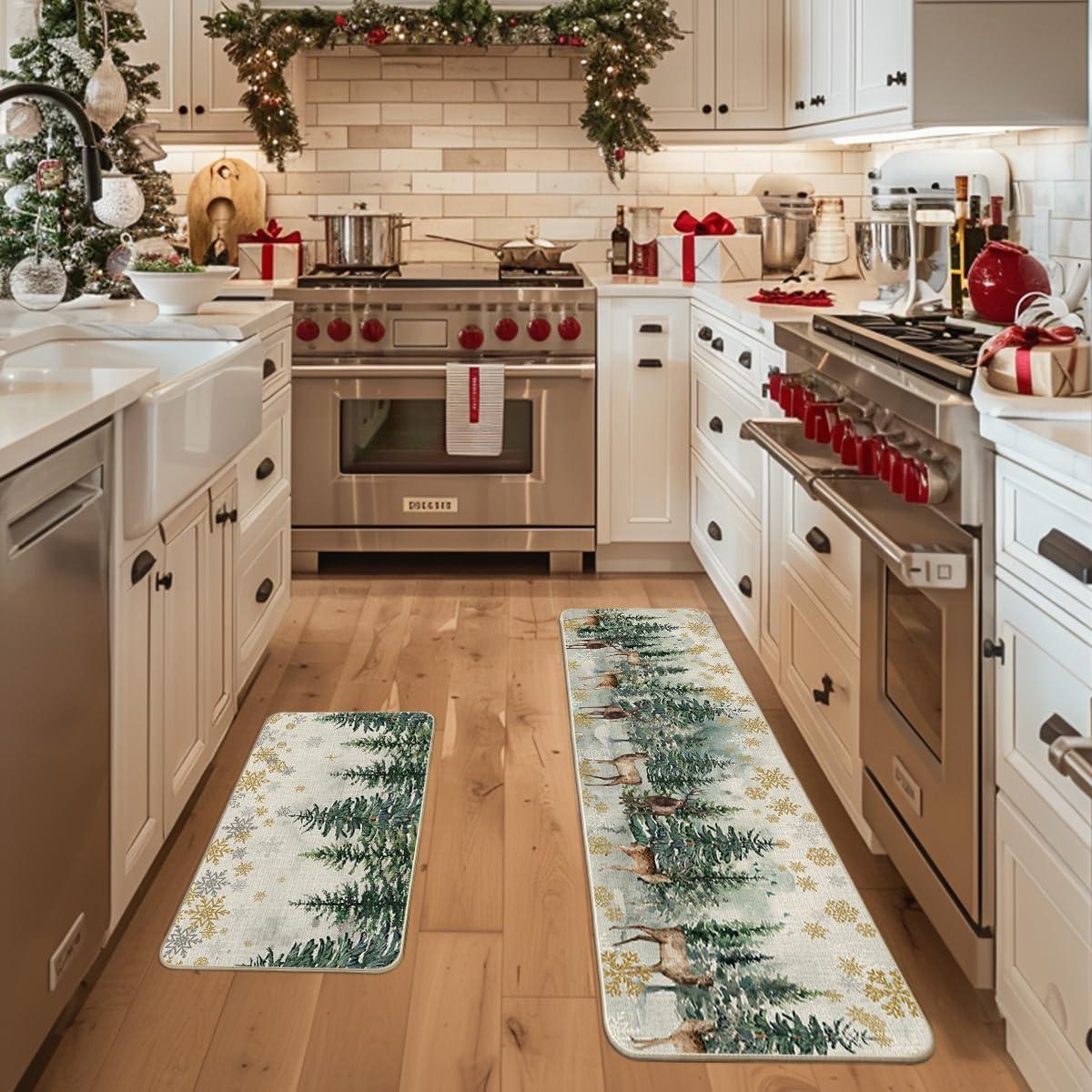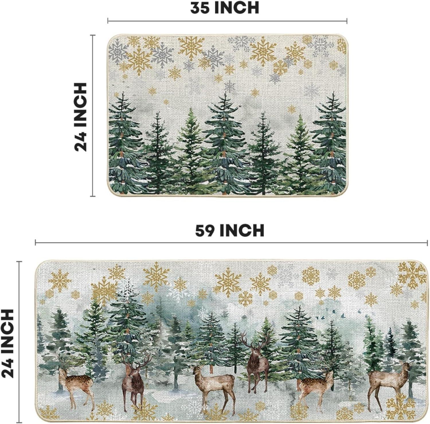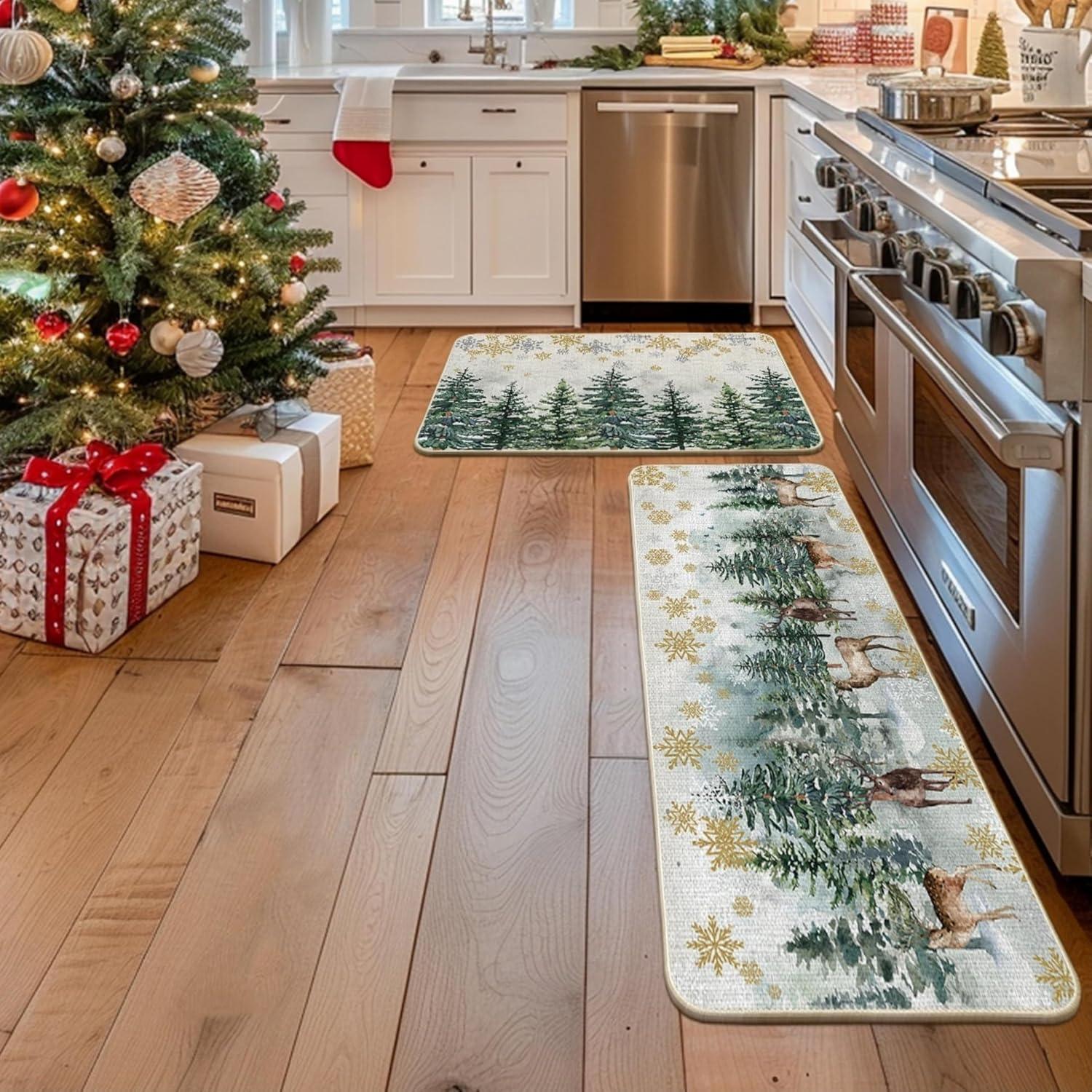 Artoid Mode Xmas Trees Deer Snowflakes Christmas Kitchen Mats Set of 2, Winter Home Decor Low-Profile Kitchen Rugs for Floor – 17×29 and 17×47 Inch(Green)