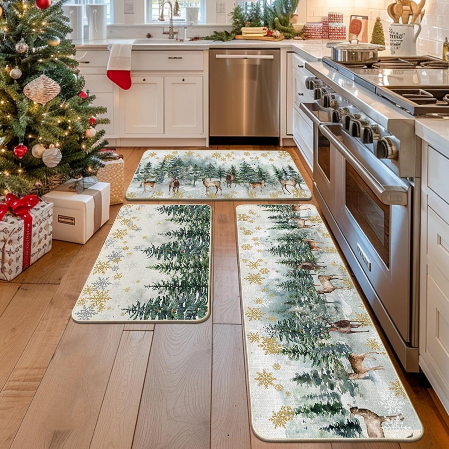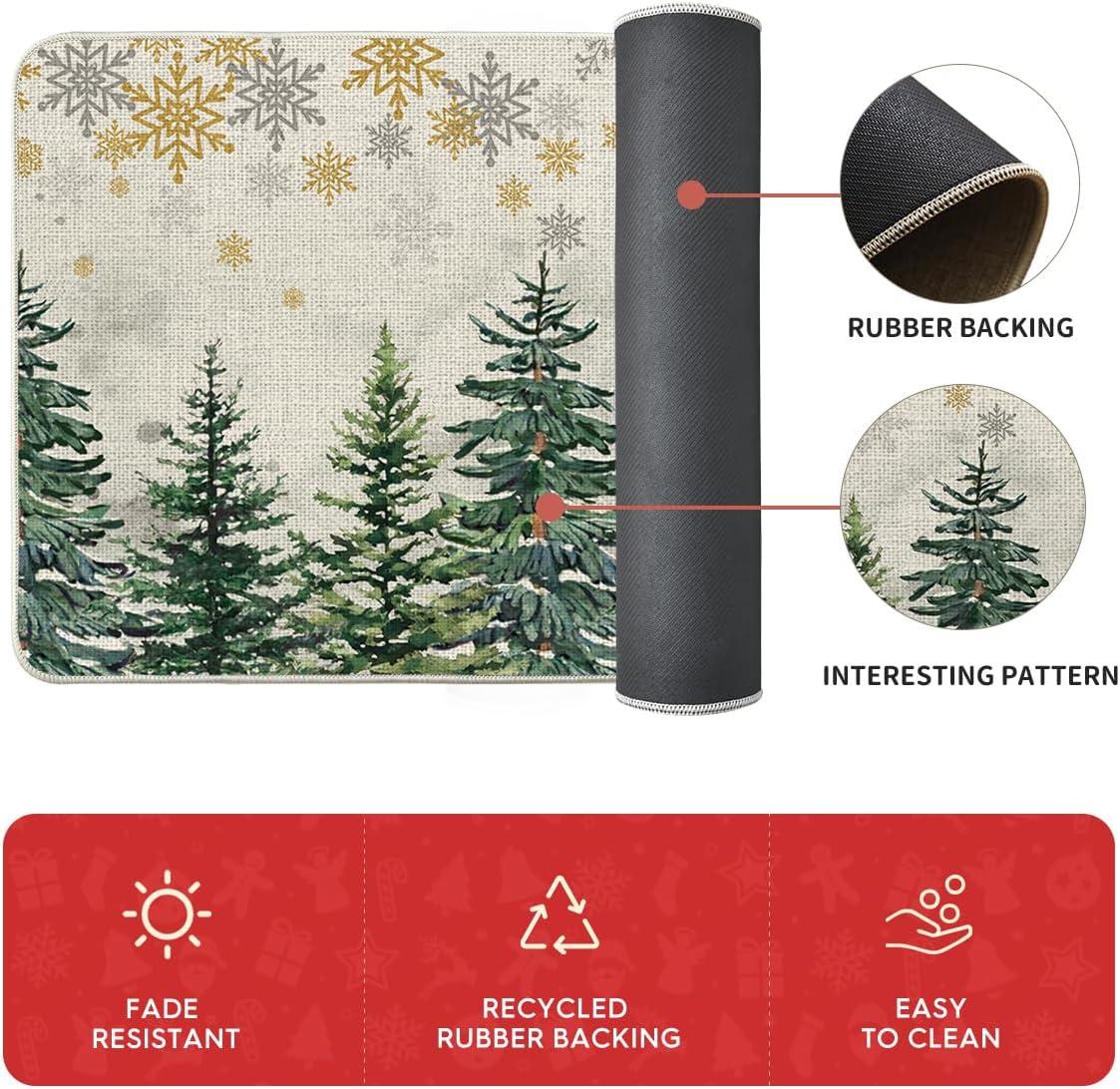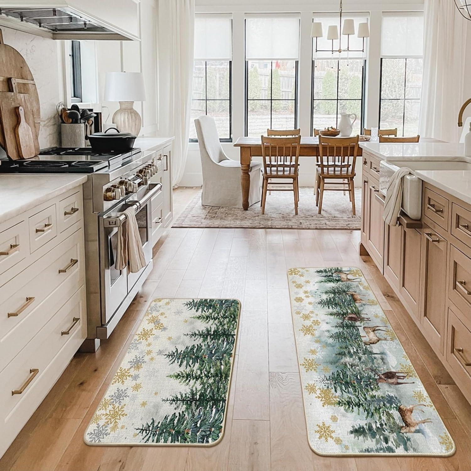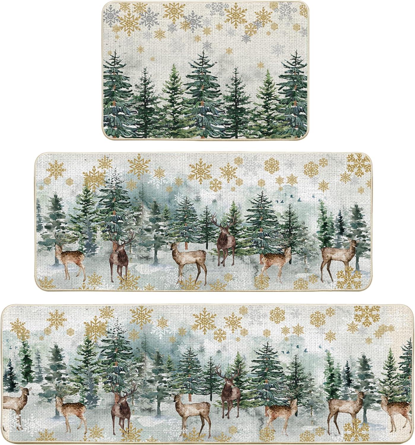 Artoid Mode Xmas Trees Deer Snowflakes Christmas Kitchen Mats Set of 2, Winter Home Decor Low-Profile Kitchen Rugs for Floor – 17×29 and 17×47 Inch(Green)