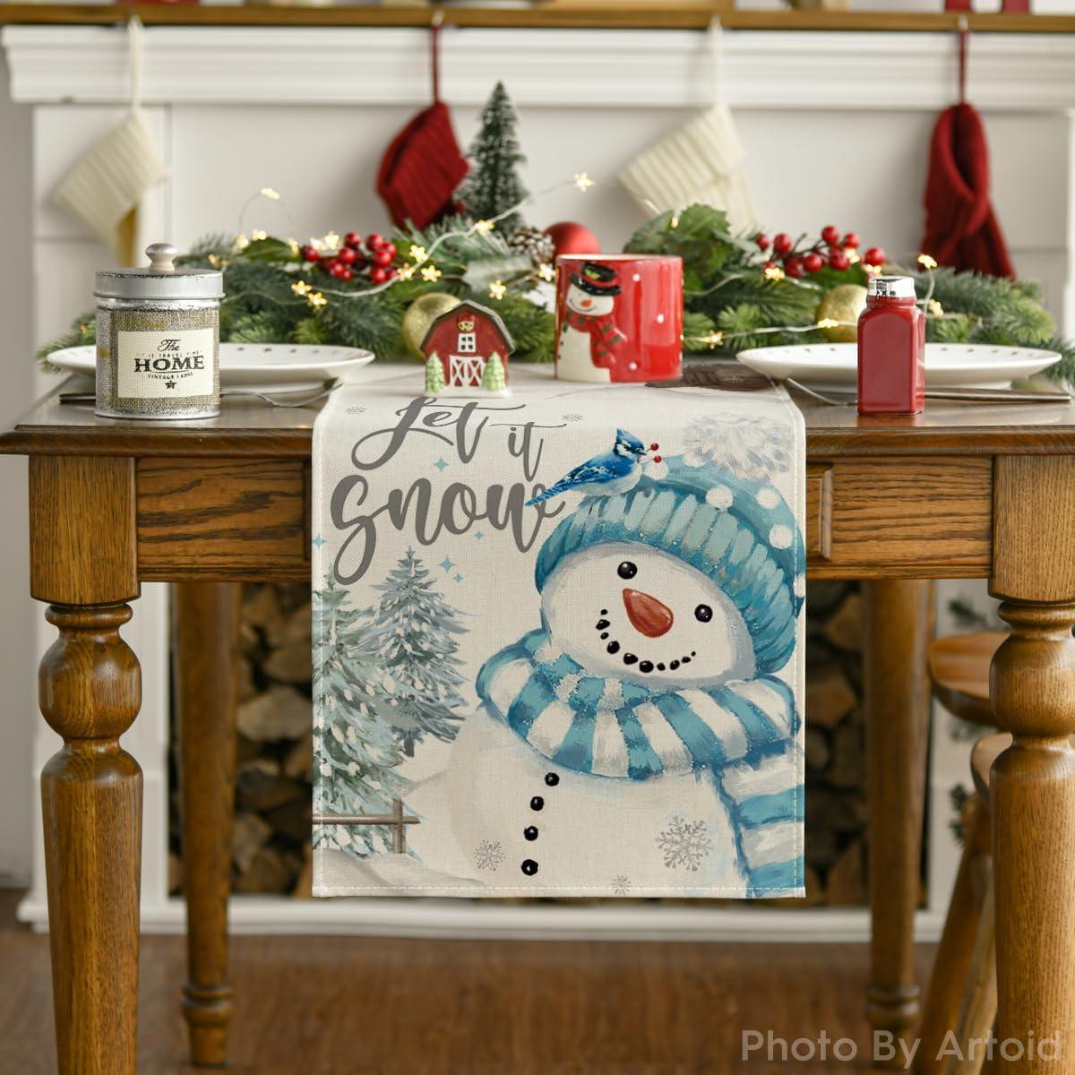 Artoid Mode Xmas Trees Let It Snow Blue Snowman Christmas Table Runner, Seasonal Winter Holiday Kitchen Dining Table Decoration for Home Party Decor 13×72 Inch(Blue)