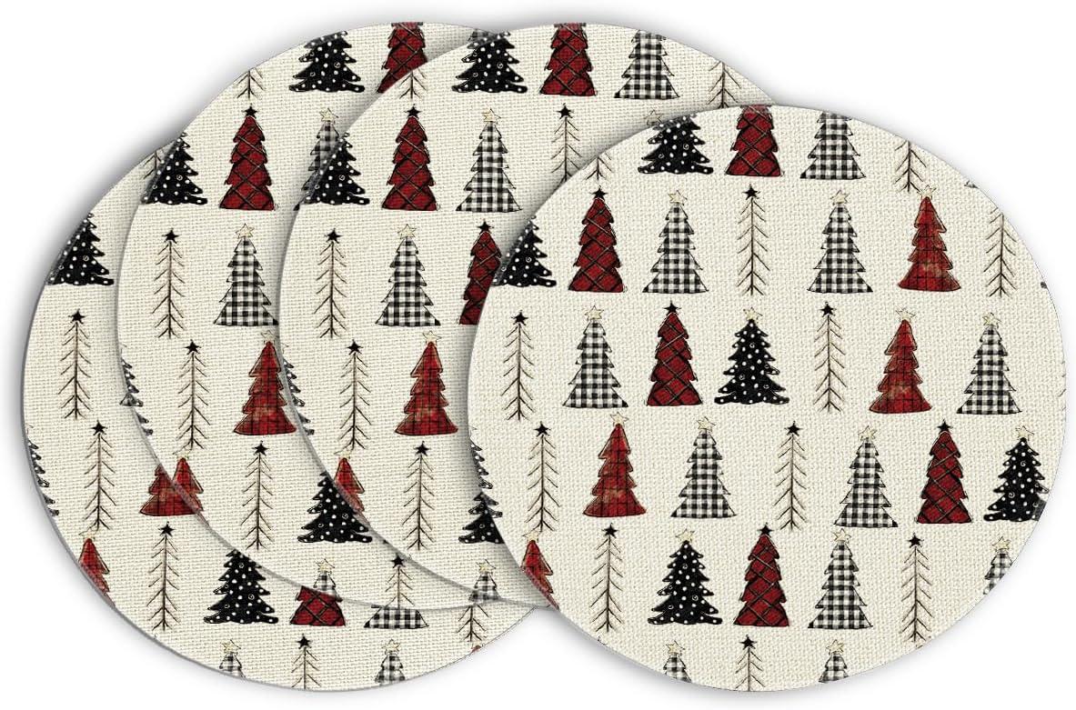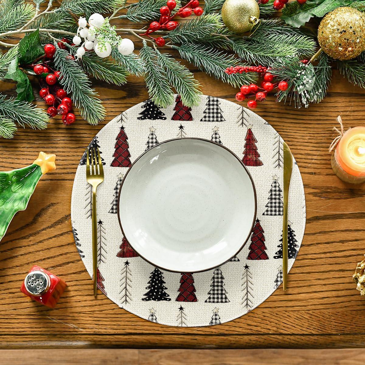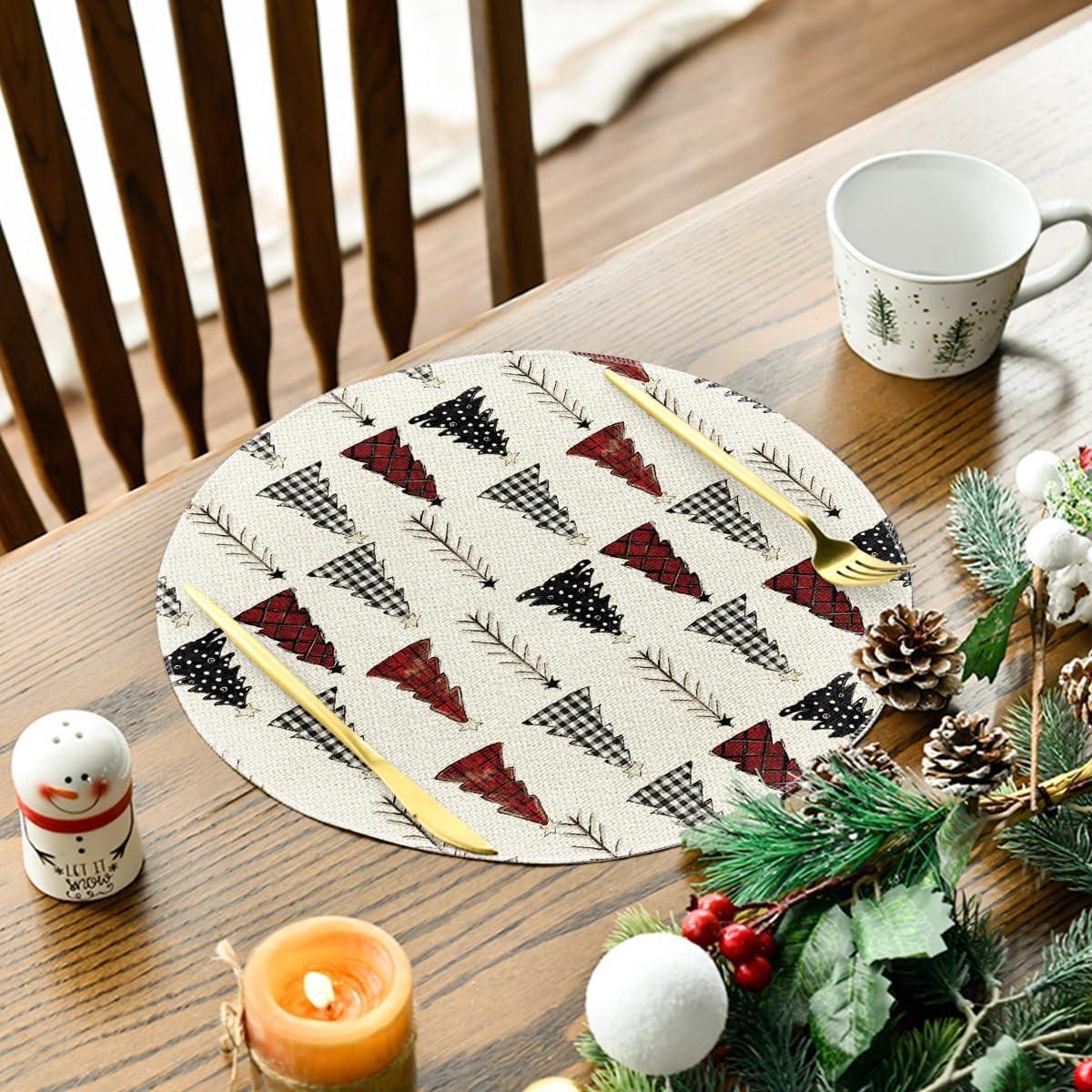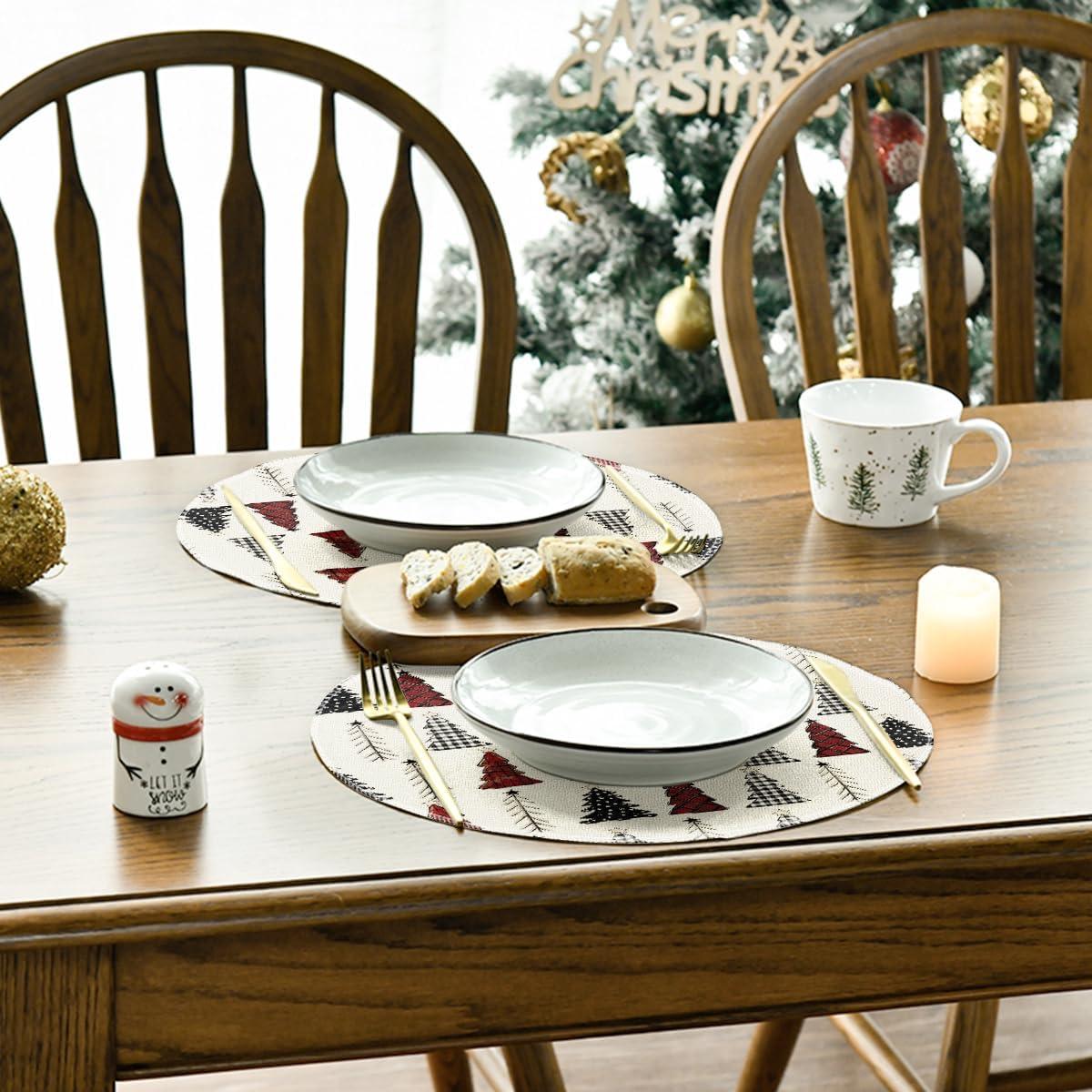 Artoid Mode Xmas Trees Merry Christmas Round Placemats Set of 4, 14 Inch Winter Round Table Mats for Dining Decoration(Red/Beige)
