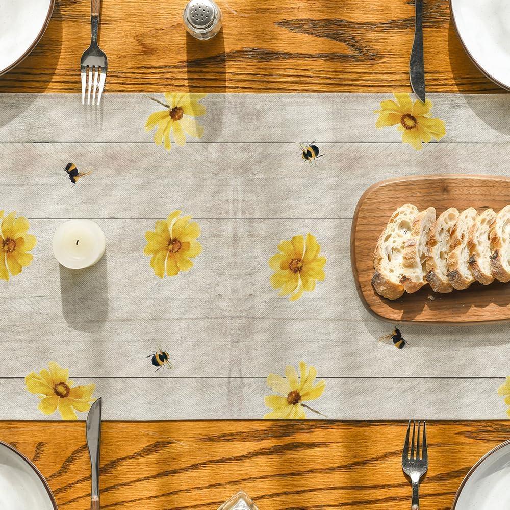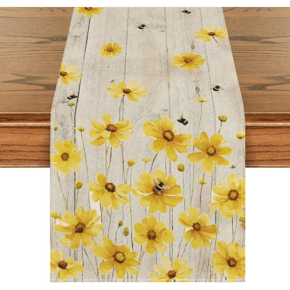 Artoid Mode Yellow Flowers Daisy Bees Summer Table Runner, Seasonal Easter Fall Holiday Kitchen Dining Table Decoration for Home Party Indoor 13×72 Inch(Wood)