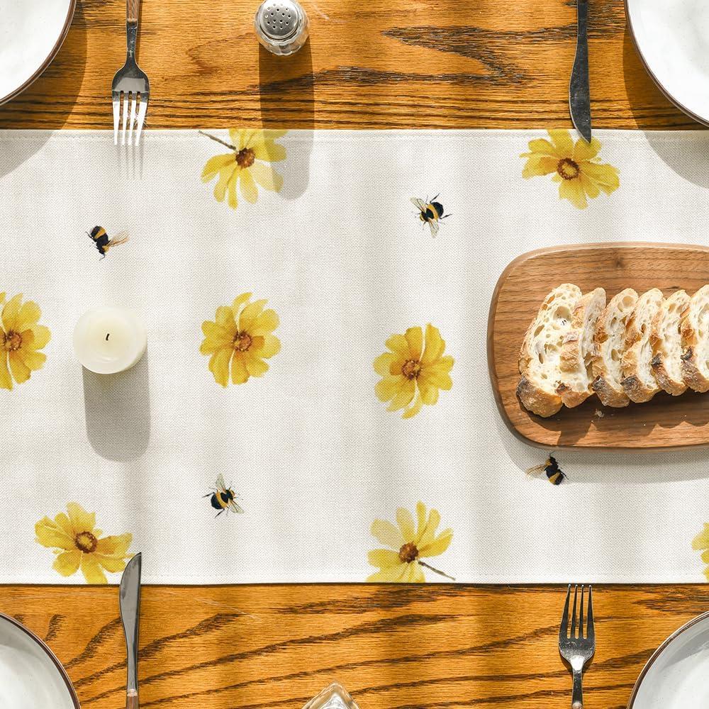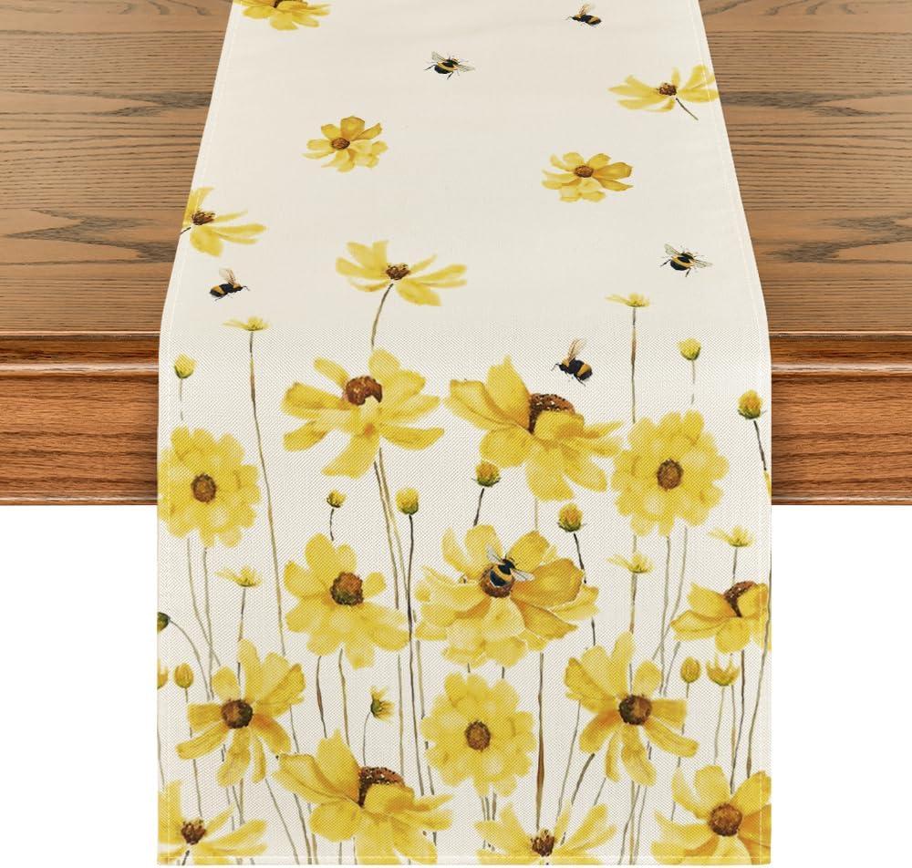 Artoid Mode Yellow Flowers Daisy Bees Summer Table Runner, Seasonal Easter Fall Holiday Kitchen Dining Table Decoration for Home Party Indoor 13×72 Inch(Yellow)